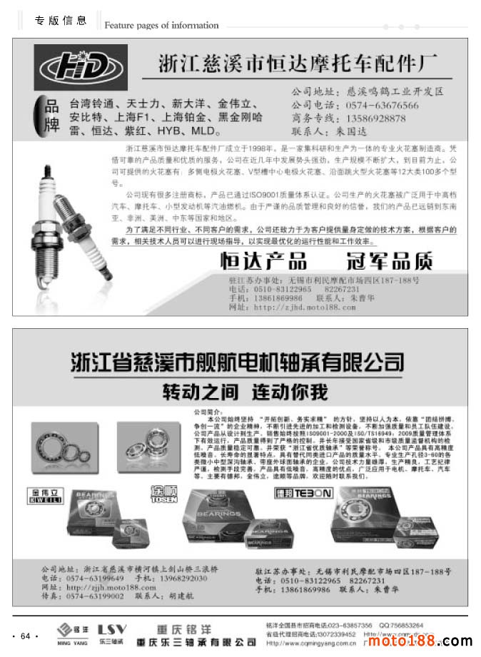 64 浙江慈溪市恒达摩托车配件厂+浙江省慈溪市舰航电机轴承有限公司