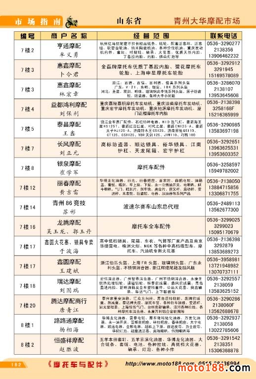 继2010年出版的《中国摩托车配件市场指南》系列丛书第一版本《华东市场指南》已经三年了,三年来华东市场是全国摩配市场变化最大的市场,以往的市场有的不复存在,有的搬迁形成新的市场,有的市场被部分改造,市场在缩小,如果仅从这些已经形成市场的角度来看华东市场规模在严重的收缩,刚开始我们打算编新版《华东市场指南》时,初步估似乎要减少不少单位,但等到汇总后,华东市场的总的经销商数目不仅没有减少,甚至比上一个版本还有所增加,总数有2800多家企业,因而书的内容比以前更充实,有不少以前不在市场上的企业,通过资料汇总,又经过逐户电话校对,这本书的准确率非常高,书中的信息都是2013年采集的。
