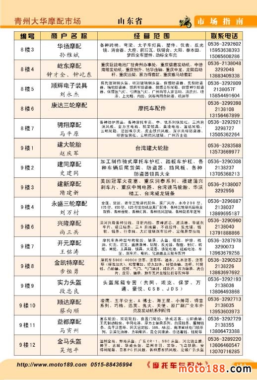 继2010年出版的《中国摩托车配件市场指南》系列丛书第一版本《华东市场指南》已经三年了,三年来华东市场是全国摩配市场变化最大的市场,以往的市场有的不复存在,有的搬迁形成新的市场,有的市场被部分改造,市场在缩小,如果仅从这些已经形成市场的角度来看华东市场规模在严重的收缩,刚开始我们打算编新版《华东市场指南》时,初步估似乎要减少不少单位,但等到汇总后,华东市场的总的经销商数目不仅没有减少,甚至比上一个版本还有所增加,总数有2800多家企业,因而书的内容比以前更充实,有不少以前不在市场上的企业,通过资料汇总,又经过逐户电话校对,这本书的准确率非常高,书中的信息都是2013年采集的。