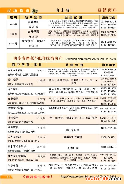 继2010年出版的《中国摩托车配件市场指南》系列丛书第一版本《华东市场指南》已经三年了,三年来华东市场是全国摩配市场变化最大的市场,以往的市场有的不复存在,有的搬迁形成新的市场,有的市场被部分改造,市场在缩小,如果仅从这些已经形成市场的角度来看华东市场规模在严重的收缩,刚开始我们打算编新版《华东市场指南》时,初步估似乎要减少不少单位,但等到汇总后,华东市场的总的经销商数目不仅没有减少,甚至比上一个版本还有所增加,总数有2800多家企业,因而书的内容比以前更充实,有不少以前不在市场上的企业,通过资料汇总,又经过逐户电话校对,这本书的准确率非常高,书中的信息都是2013年采集的。