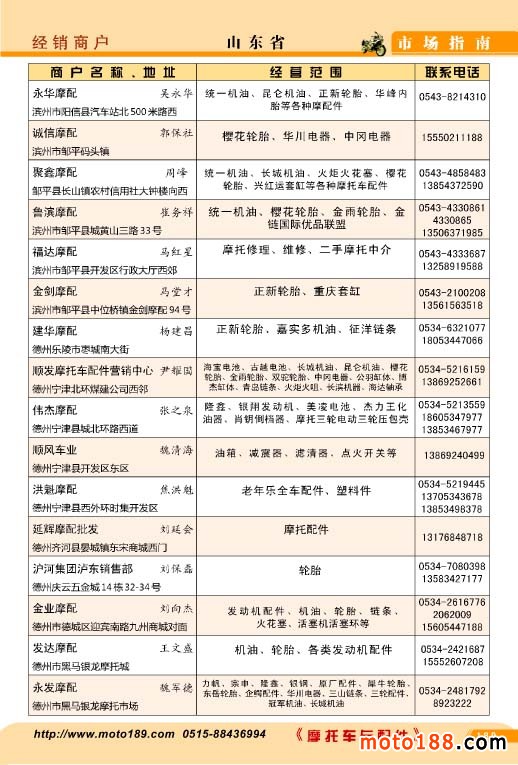 继2010年出版的《中国摩托车配件市场指南》系列丛书第一版本《华东市场指南》已经三年了,三年来华东市场是全国摩配市场变化最大的市场,以往的市场有的不复存在,有的搬迁形成新的市场,有的市场被部分改造,市场在缩小,如果仅从这些已经形成市场的角度来看华东市场规模在严重的收缩,刚开始我们打算编新版《华东市场指南》时,初步估似乎要减少不少单位,但等到汇总后,华东市场的总的经销商数目不仅没有减少,甚至比上一个版本还有所增加,总数有2800多家企业,因而书的内容比以前更充实,有不少以前不在市场上的企业,通过资料汇总,又经过逐户电话校对,这本书的准确率非常高,书中的信息都是2013年采集的。
