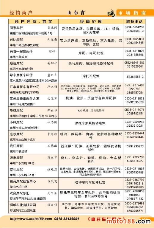 继2010年出版的《中国摩托车配件市场指南》系列丛书第一版本《华东市场指南》已经三年了,三年来华东市场是全国摩配市场变化最大的市场,以往的市场有的不复存在,有的搬迁形成新的市场,有的市场被部分改造,市场在缩小,如果仅从这些已经形成市场的角度来看华东市场规模在严重的收缩,刚开始我们打算编新版《华东市场指南》时,初步估似乎要减少不少单位,但等到汇总后,华东市场的总的经销商数目不仅没有减少,甚至比上一个版本还有所增加,总数有2800多家企业,因而书的内容比以前更充实,有不少以前不在市场上的企业,通过资料汇总,又经过逐户电话校对,这本书的准确率非常高,书中的信息都是2013年采集的。